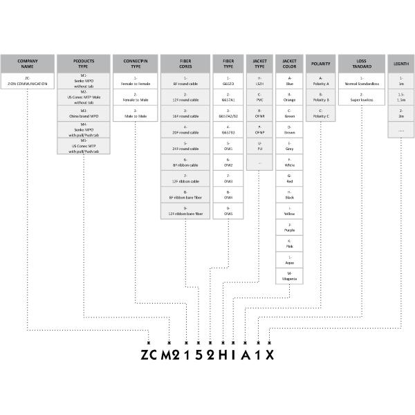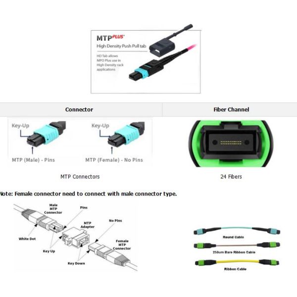 MTP connector types are distinguished according to the IEC 61754-7 regulations: core numbers (array number), male head (Male, Female), polarity (PC or APC).